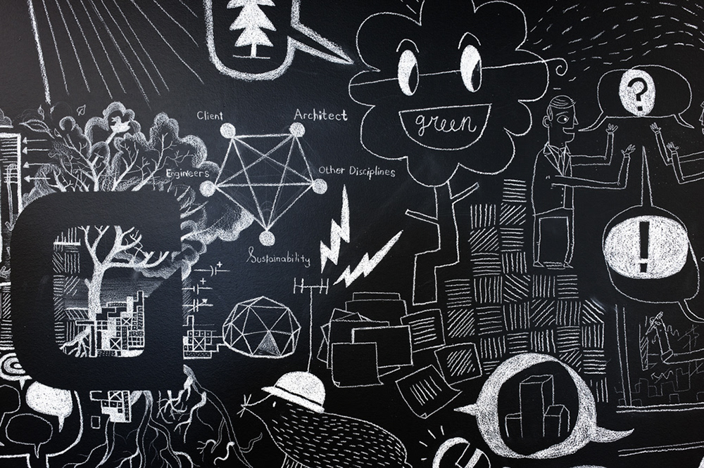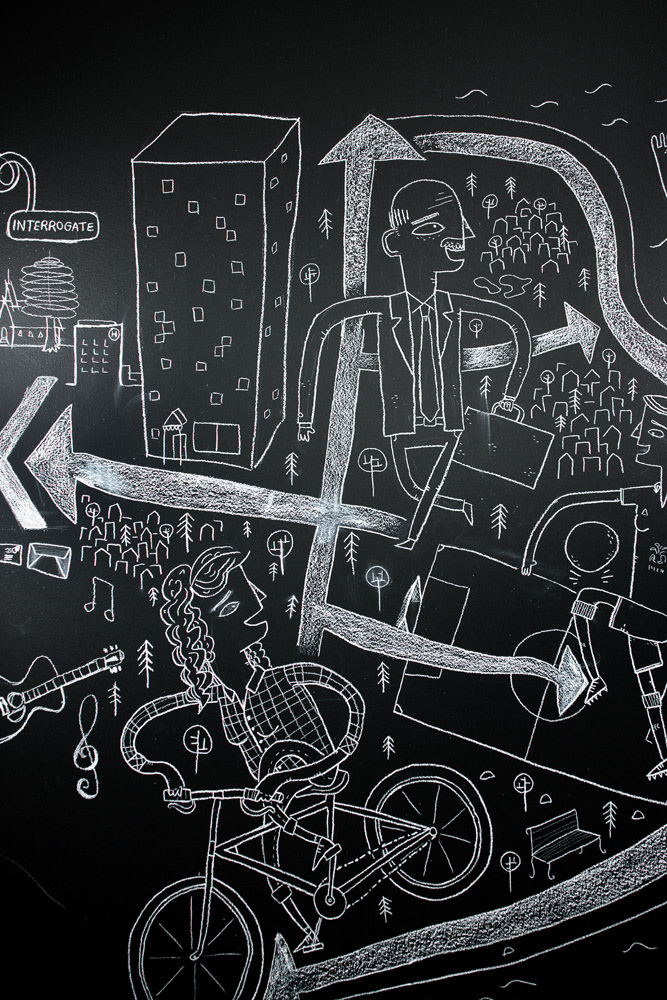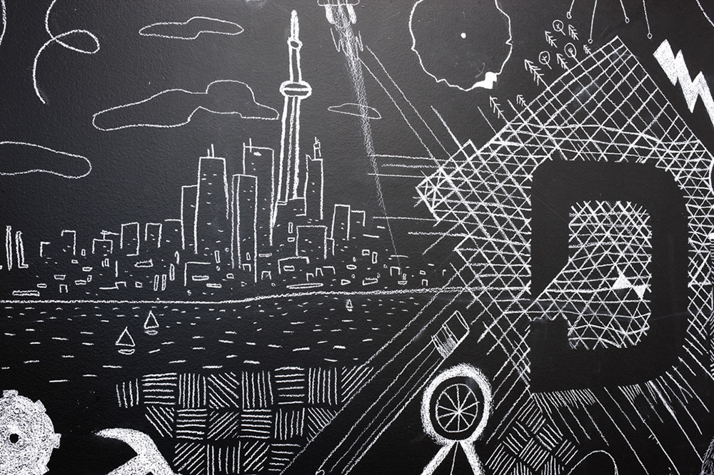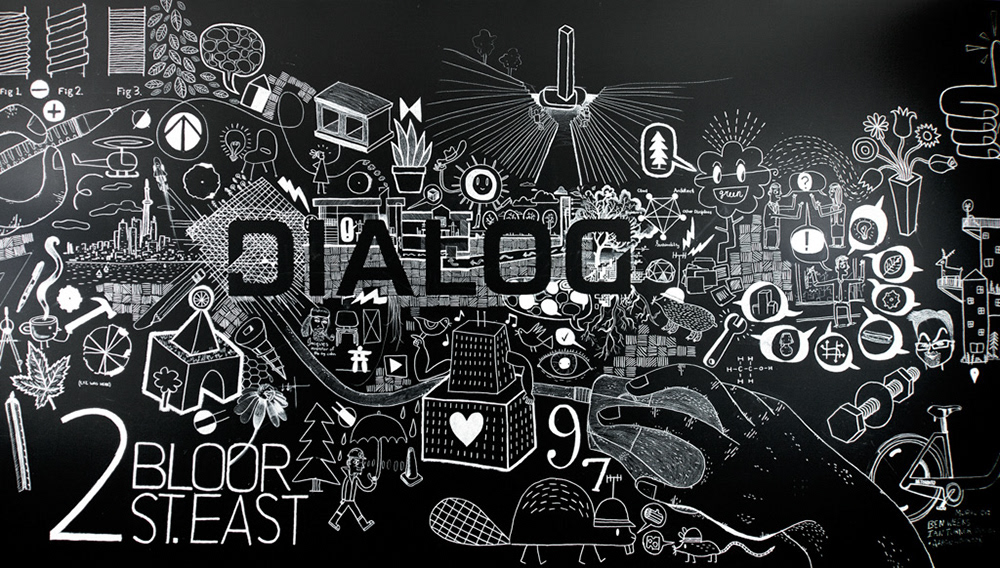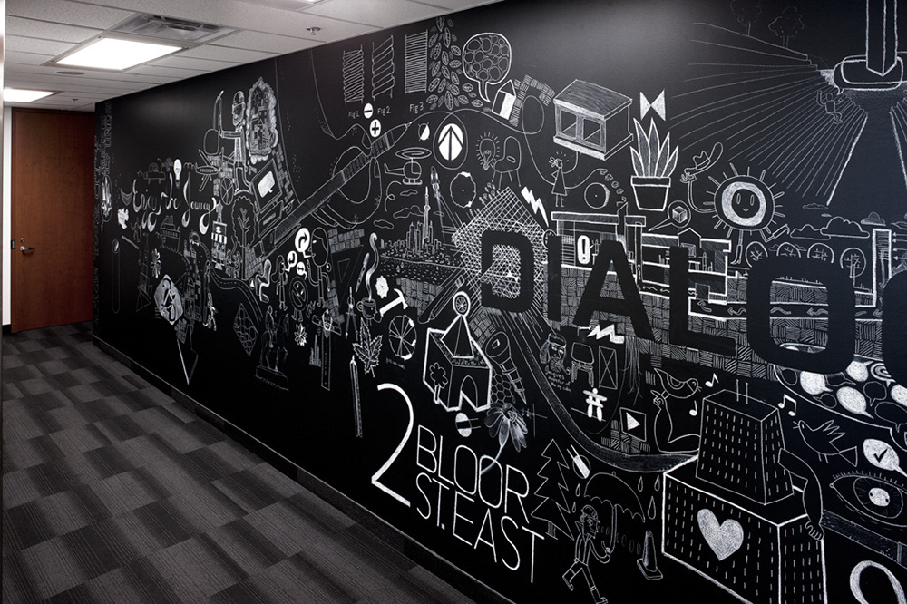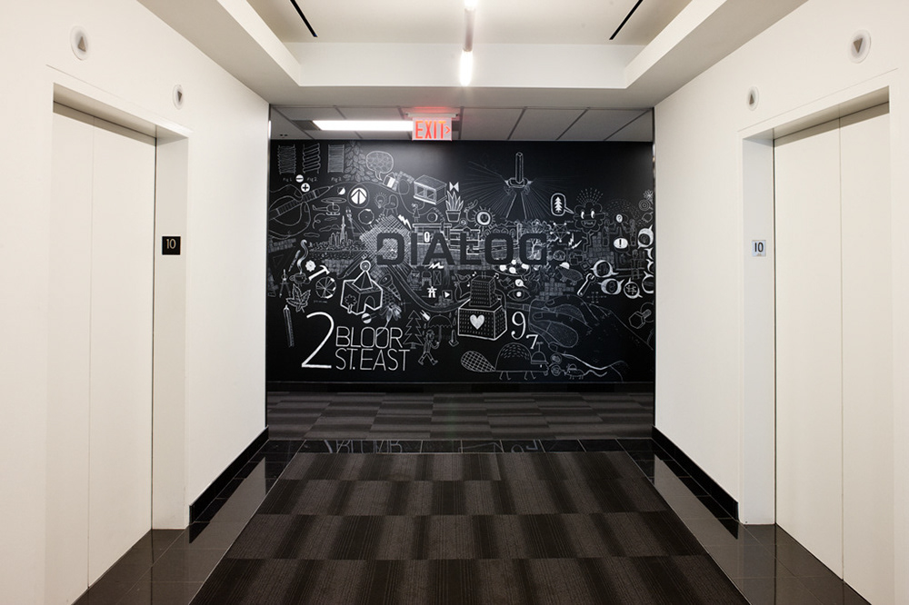 Dialog is an architecture firm in Toronto. Their design team had spent a year collecting various quotes, sketches and inspiring things from their staff but were having difficulty editing and combining them in a visually striking way. We studied that data together and discovered broader themes to extend the visual language of the mural even further. The company's vision, structure and expertise were expressed visually in an integrated way. Acknowledging that people are emotional beings by greeting them with intelligent, beautiful artwork that also expresses a love of innovation, detail and the environment are great signals to send.