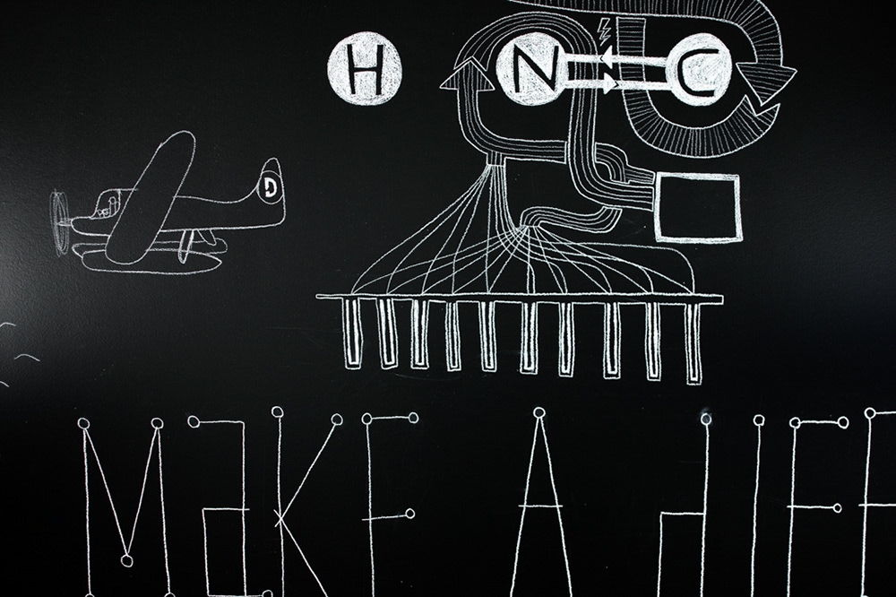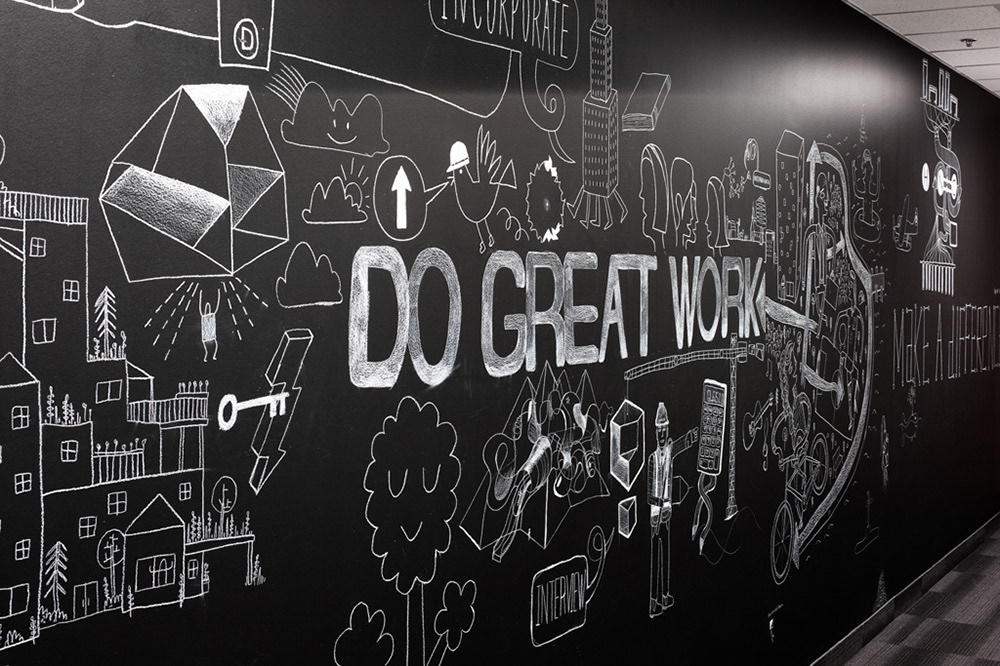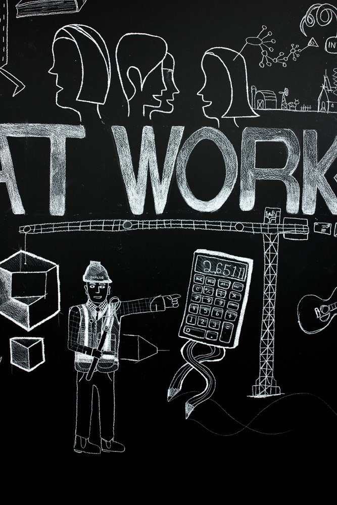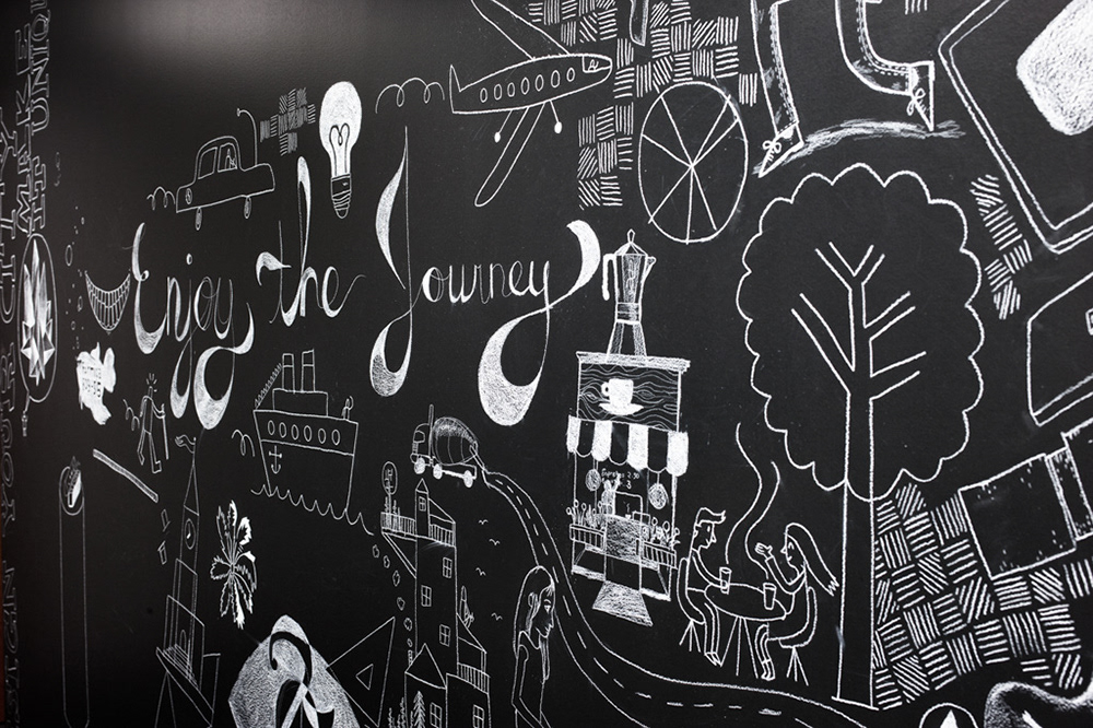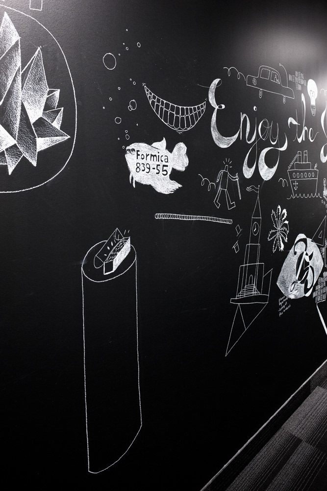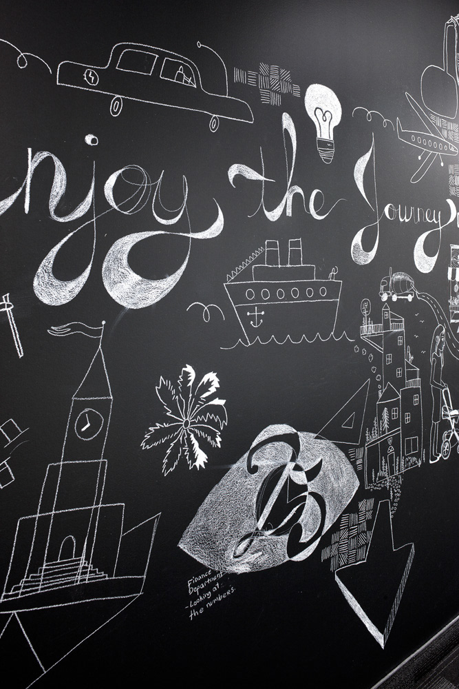 Dialog is an architecture firm in Toronto. Their design team had spent a year collecting various quotes, sketches and inspiring things from their staff but were having difficulty editing and combining them in a visually striking way. We studied that data together and discovered broader themes to extend the visual language of the mural even further. The company's vision, structure and expertise were expressed visually in an integrated way. Acknowledging that people are emotional beings by greeting them with intelligent, beautiful artwork that also expresses a love of innovation, detail and the environment are great signals to send.