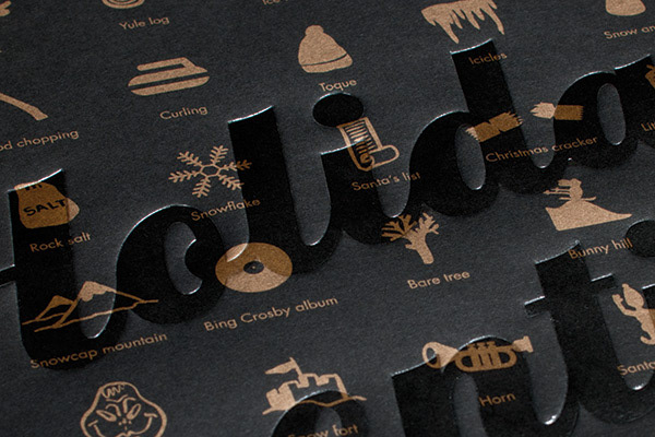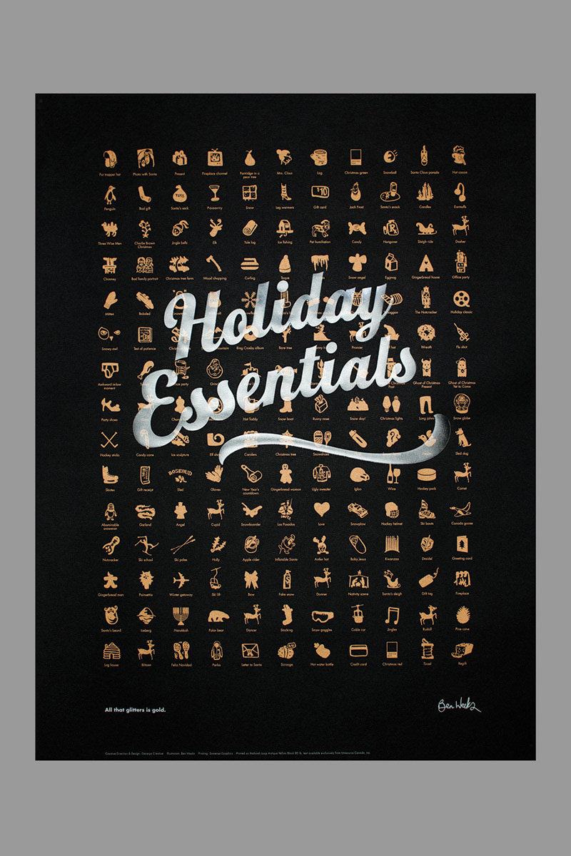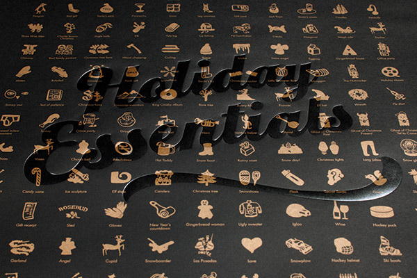 Holiday Essentials poster with a big icon set and super slick print production techniques, mailed out in tubes to our clients.