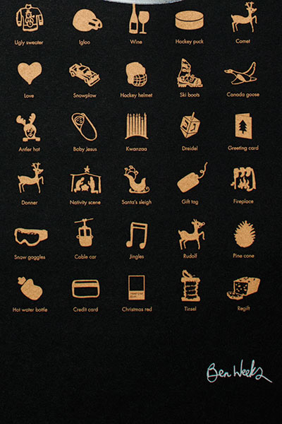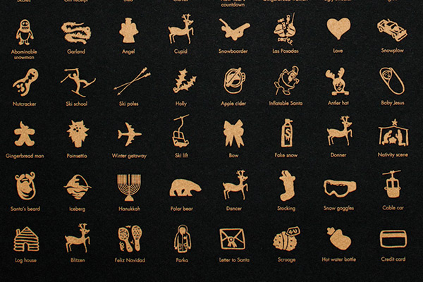 Printed on black stock with a triple hit of gold metallic ink, the icons gleam in the candle light as does the clear foil message made with a custom die. Multiple white plates were used to print personalized logos at the bottom for each contributor on the same print run. 165 icons by Ben Weeks. Design by Genesys Creative. Printing by Somerset Graphics. Paper by Unisource. Copywriting Consulting: Doug Dolan. Photography by Chris Thomaidis.