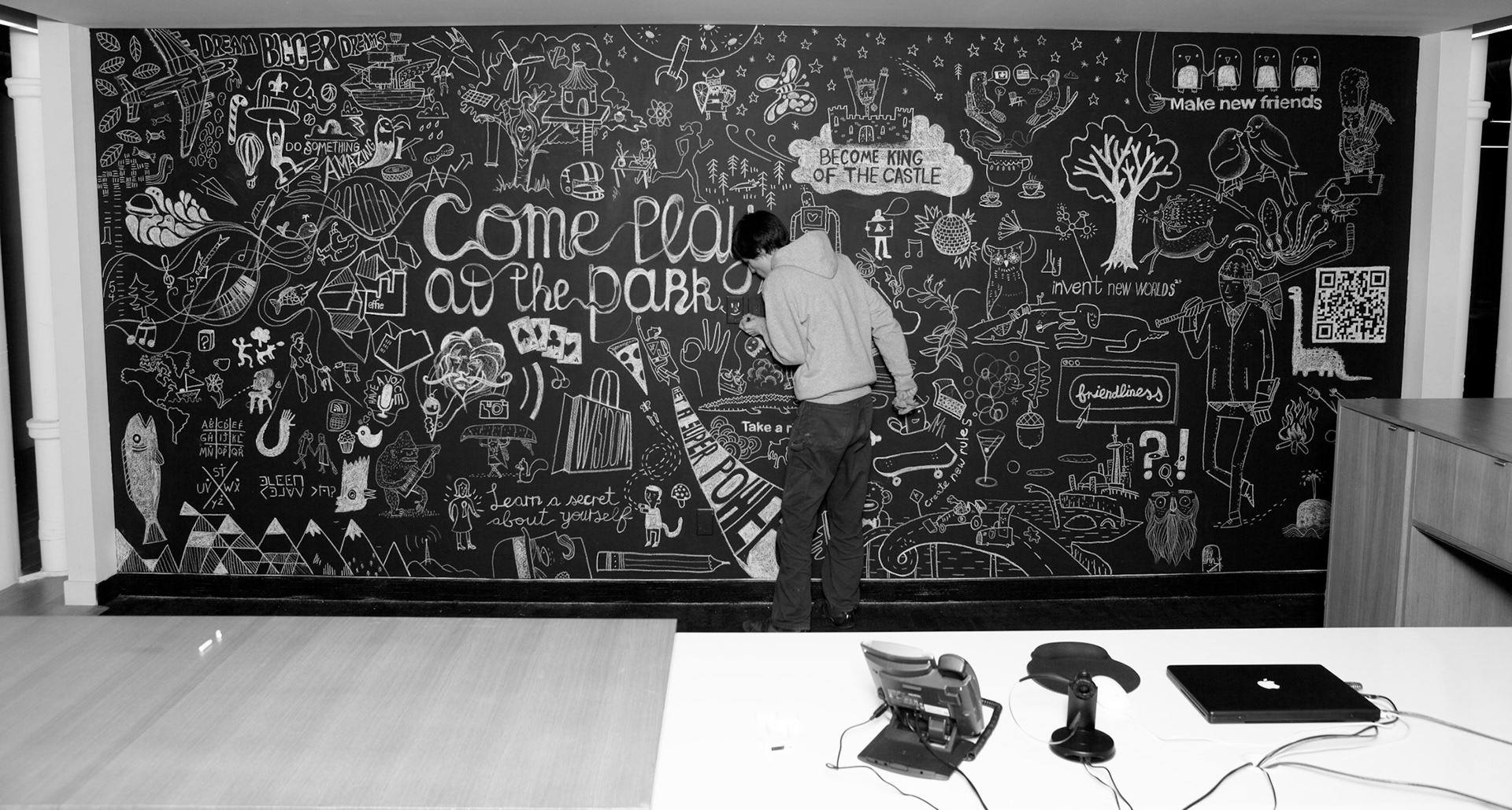 Featured in Creative Review's 2010 illustration Annual. Easter-egg: Look for the bit of stop-motion animation with the rocket beside the tree (upper middle about half way through the video.) This was done for the lobby of Juniper Park (a BBDO ad agency) to help visiting clients get into an open, creative frame of mind.